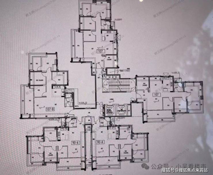 建面107平四房两卫,四开间朝南,3+1房布局,主卧环幕飘台设计,约6.8米跑道式阳台,客餐厅一体化设计,107平分为AB两个户型,这个户型位于2栋的后边两侧,横厅户型,实用率在112%左右,总价340-380万左右。
