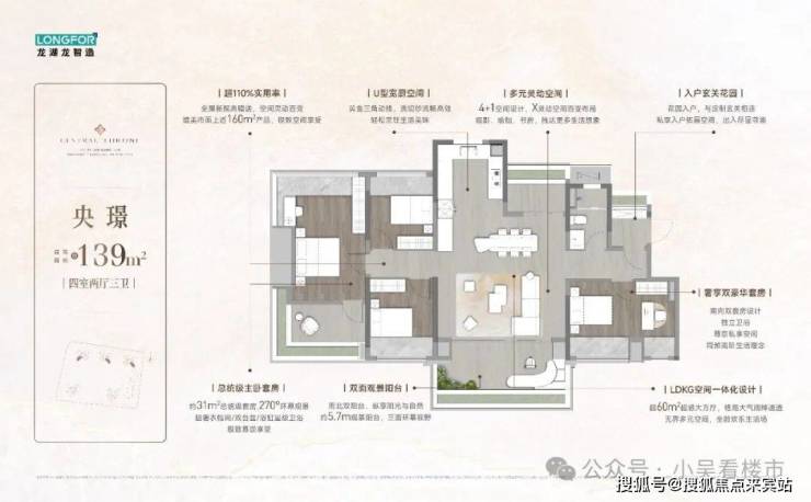 建面139平四房两卫,首推仅30套,五开间朝南,面宽约17.3米,南北双阳台设计,可做成60平的大客厅,双主套设计,主卧套房约31平,搭配270度飘窗+衣帽间,这个户型位于1栋的南侧边户,望园林景观,遮挡比较少,入户玄关有点小,实用率在116%左右,总价490-550万左右。