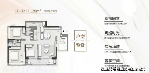 建筑面积约128㎡ 四房两厅两卫:B-02户型,宽敞舒适,适合大家庭居住。