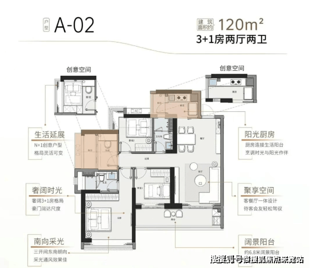 建筑面积约120㎡ 3+1房两厅两卫:A-02户型,提供灵活的空间布局,满足家庭成长需求。