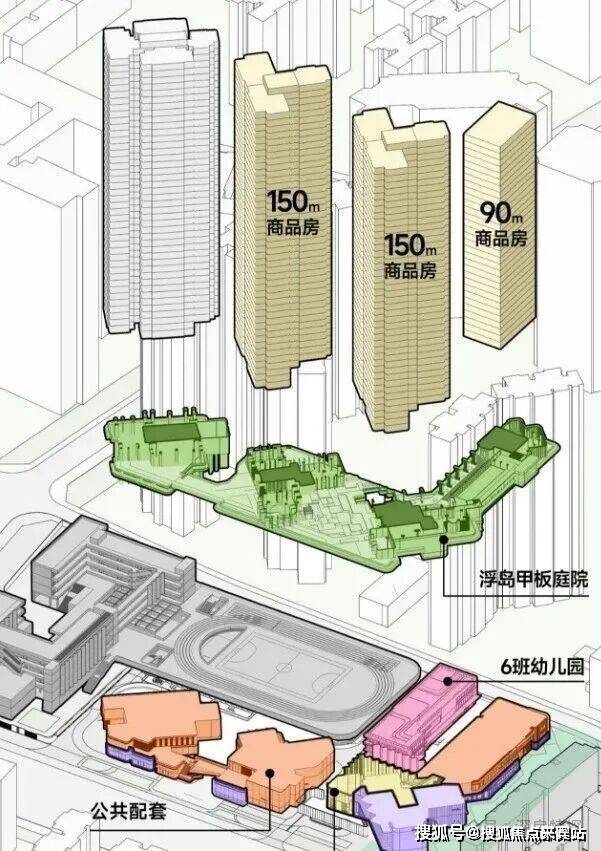 说直接点,就是将四栋建筑安置在这个甲板上,形成一个超级社区底盘+ 浮岛绿化甲板的模式。