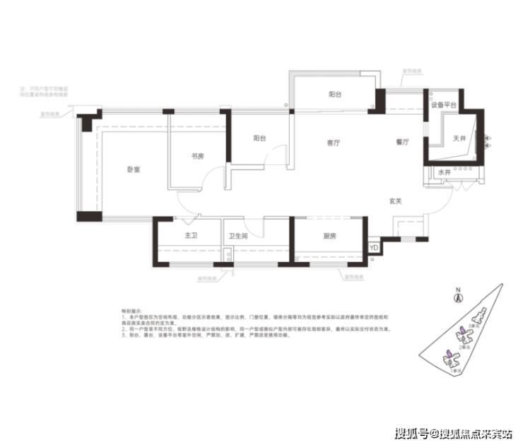 横厅设计,入户玄关处可以做收纳,全屋多飘窗,主卧套房设计,“阳台”和“书房”处实际可以做房间。