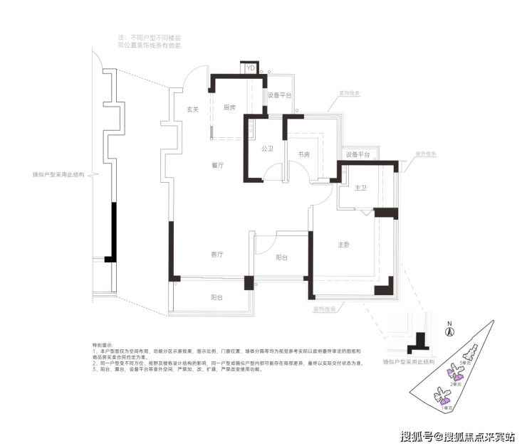 竖厅动静分区,S型墙内嵌冰箱位,“阳台”和“书房”处实际可以做房间。