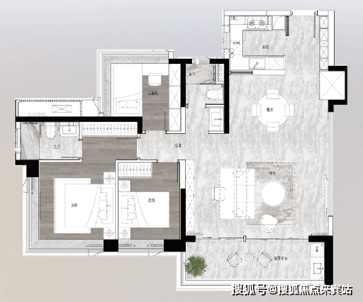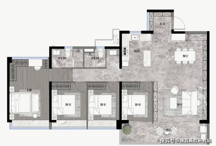 建筑面积105㎡的四房两厅两卫,四开间朝南,LDKB一体化设计,5.9m开间巨幕客厅,主卧270°全景飘窗。