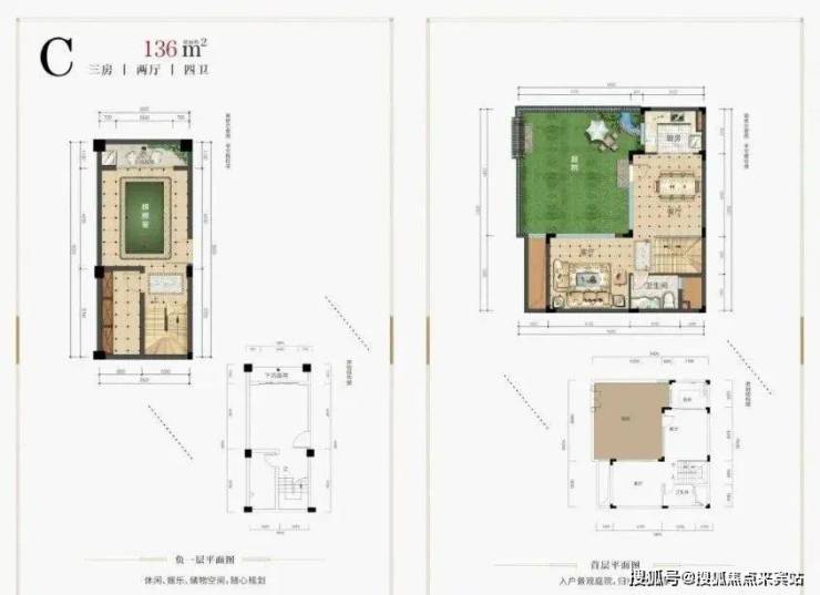 136㎡合院C户型户内庭院面积近60㎡,饱览天地的主庭院、一角风韵的下沉式庭院、情景交融的超大露台……各有情致,趣意盎然。