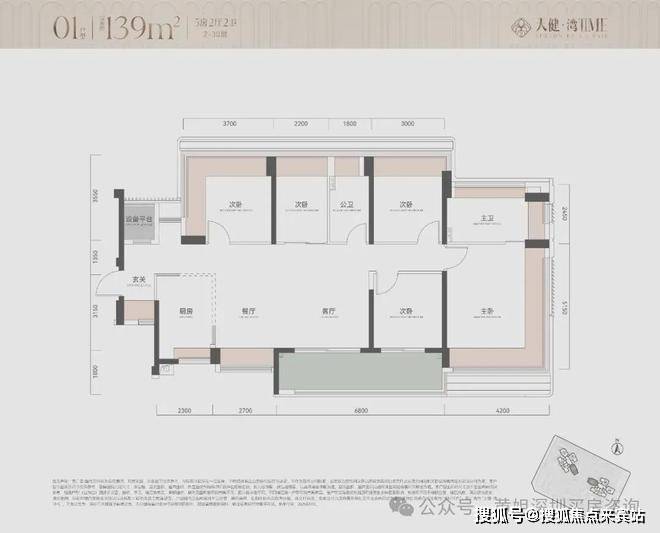 亮点:该户型为正5房2厅2卫,四面采光 + 270°精装主卧飘窗+6.8米巨幕海景阳台,5个房间均为标准尺寸。