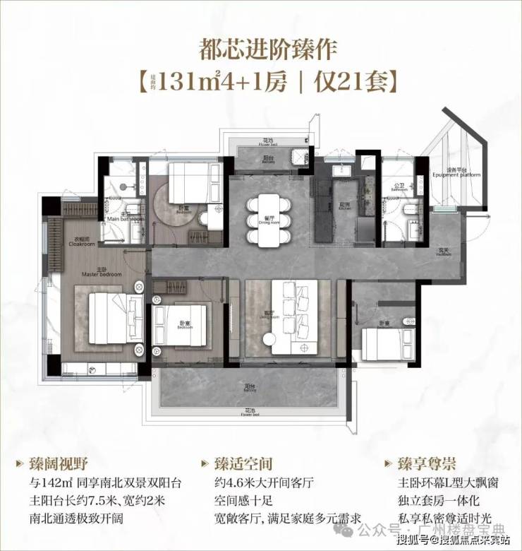 建面131平4+1房,该户型跟之前142平户型有点像,南北对流双阳台,主阳台长达7.5米,约4.6米的客厅开间,加上设备平台的赠送,空间感完全不输160平。