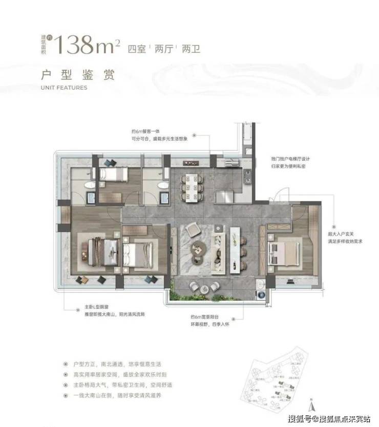 入户玄关巧妙隔绝视线,隐私感拉满。客餐厅南北通透,大客厅除传统布局外,还增设茶台区域,两者共享 6 米多宽景阳台,搭配 U 型厨房与方正餐厅,公区气场全开。