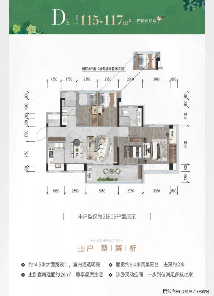 117㎡四房二卫:南北通透,约13㎡新规大阳台,尊享舒适;