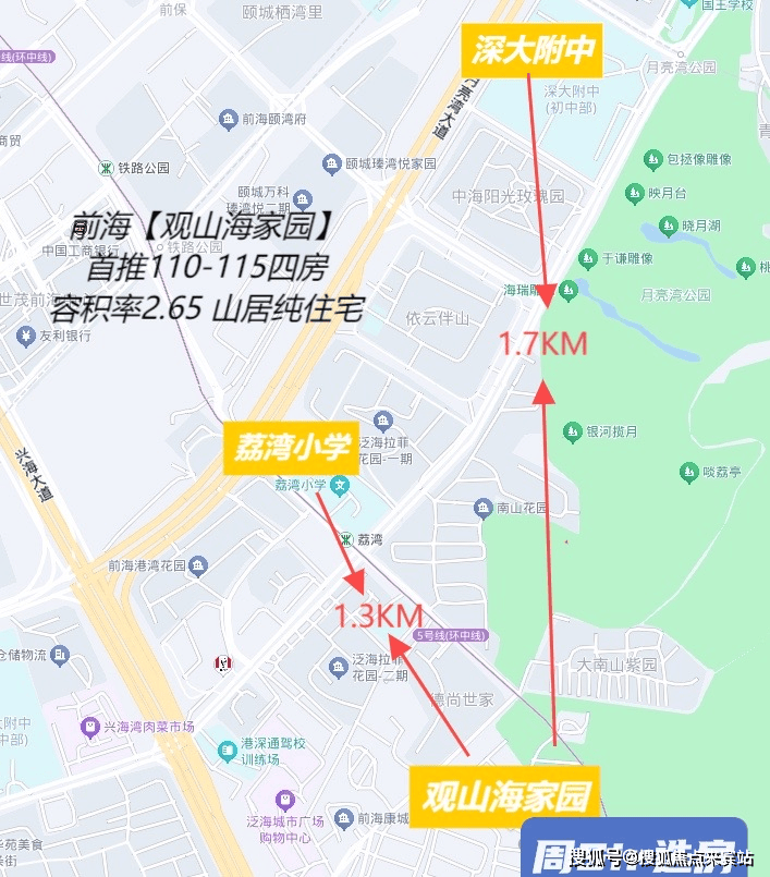观山海家园项目名为【远洋·观山海家园】,位于兴海大道与沿山交汇处东南侧,大南山脚下,距离5号线“荔湾站”约650米。地处当今深圳最具发展潜力的前海合作区。项目由远洋集团旗下的深圳市远荔实业有限公司开发建设,总占地面积约4.24万平方米,总建筑面积约16.3万平方米,容积率仅为2.65,绿化率高达30.85%。