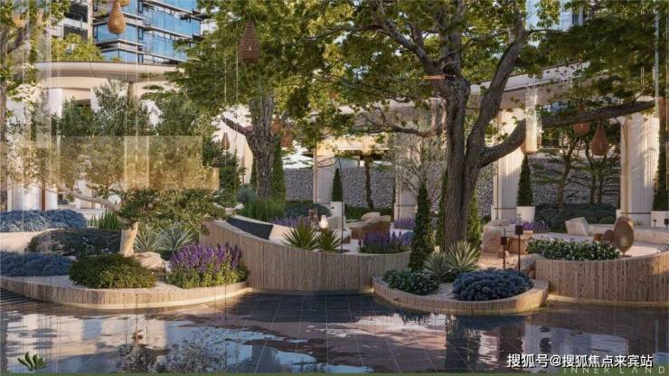 约75米风雨连廊,让业主回家不必淋雨或暴晒,两侧搭配错落有致的南法树种。每一棵树、每一个摆放位置,都经过反复推敲——不惜成本与心血。廊下是无边界社交场,廊外是南法花园。