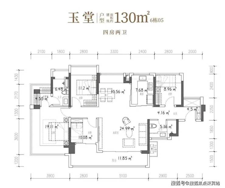 106㎡的4房2厅2卫,设计的是竖厅格局,客厅3.7米开间,LDKB一体化,S墙设计预留冰箱卡槽位,四开间朝南,动静分区,主卧270°无柱转角飘窗还带1个设备平台约1.52平,分别做到了主卧20.34㎡/次卧11.2㎡/次卧7.7㎡/次卧6.75㎡(包含墙体飘窗),U型厨房烟道外置,卫生间干湿分离,得房率约101.16%(包含赠送),客厅连接次卧出大阳台约11.76平,东南朝向。