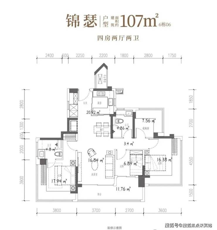 107㎡的4房2厅2卫,设计的是竖厅双龙抱珠格局,客厅3.7米开间,LDKB一体化设计,预留冰箱卡槽位,四开间朝南,主卧+2个次卧270°无柱转角飘窗,分别做到了主卧17.94㎡/次卧16.38㎡/次卧7.56㎡/次卧6.89㎡(包含墙体飘窗),U型厨房烟道外置,卫生间干湿分离,得房率约104.06%(包含赠送),客厅连接次卧出超大阳台约11.76平,东北朝向。