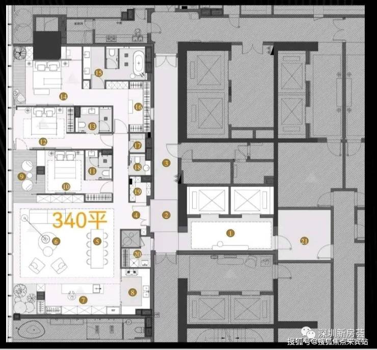 与高净值人士为邻:地处传统豪宅片区,一公里半径内有红树西岸、中信红树湾、京基御景东方、瑞河耶纳等高端住宅社区,单价超12万元。业主涵盖金融、科技各行业企业主及高管,拥有大量高净值人群以及政企资源