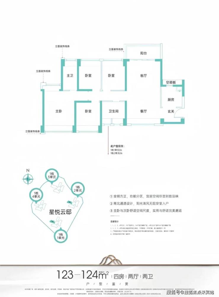 123㎡的4房2厅2卫,设计的竖厅南北通透格局,进门独立入户玄关,全屋飘窗设计,U型厨房,得房率:78.15%(不含赠送),阳台主朝东北向。