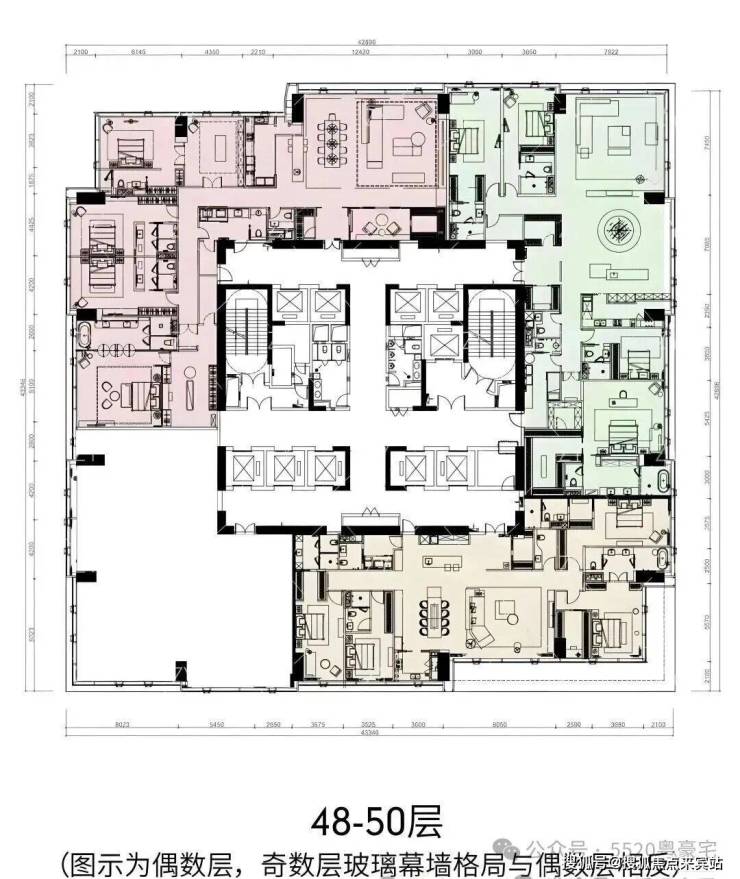 468㎡五房三厅六卫:位于1栋一、二单元高区33-38层,一层一户,仅6席。五房四套房设计,主卧L形全景落地窗,270°最佳观海位,南向超大三厅一体,动静分区布局有序。