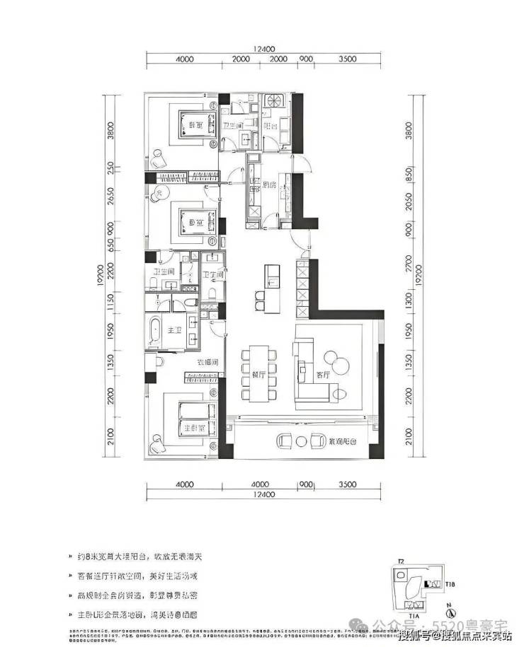 280㎡三房两厅四卫:位于1栋三、四单元24-32层,为05、08户型。拥有超8米超宽幕开间,厅出阳台可直面海景。采用三套房设计,主卧配备L形全景落地窗,占据270°最佳观海位。