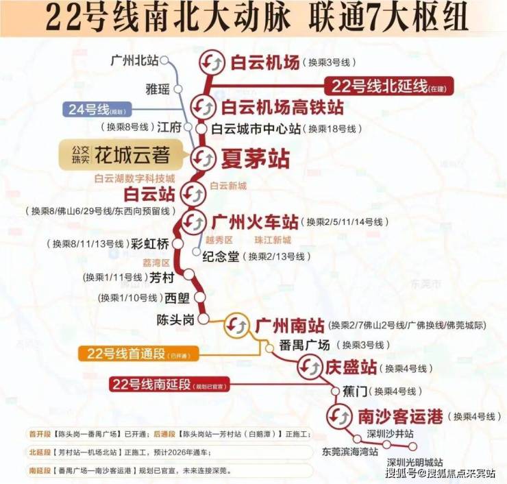 22号北延线,广州南北大动脉,时速达160公里,贯穿空港、白云棠溪、广州火车站、南站等6大枢纽,全线换乘高达16处之多,无缝接轨广州全市。