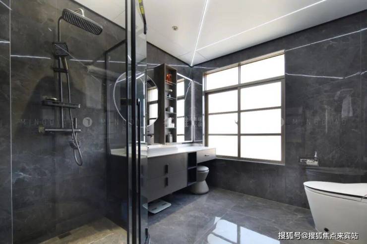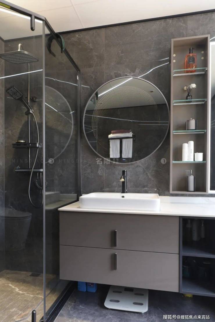 主卫区域简练大方,墙地统一的瓷砖选择,赋予整个空间连贯感和统一感。自带氛围感的圆形浴室镜,更增添了空间的精致感和现代感,使整个主卫区域显得更加时尚与舒适。