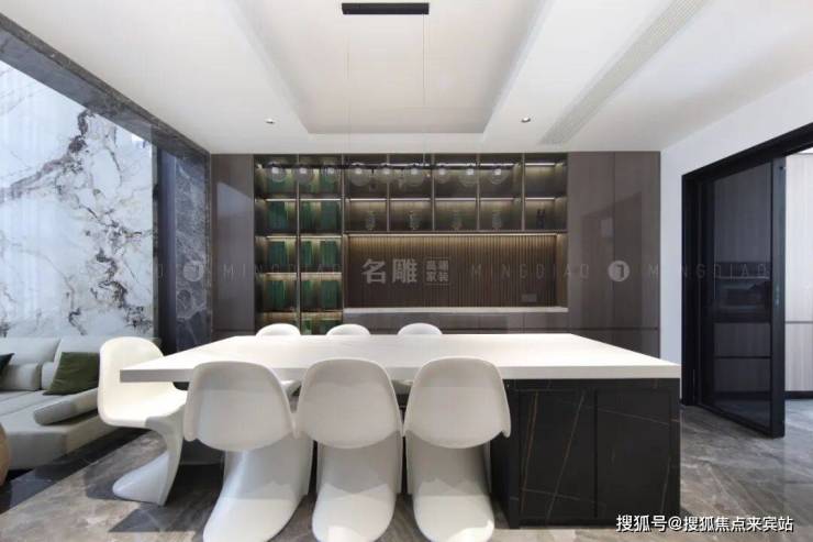多功能岛台餐桌搭配个性餐椅,满足多人用餐。一侧的木面餐边柜+玻璃柜,既保障了充足的储物空间,又统一了视觉美感。