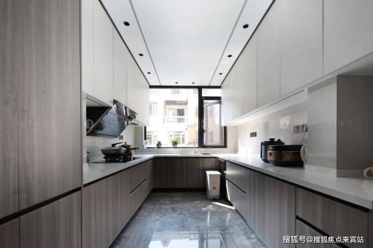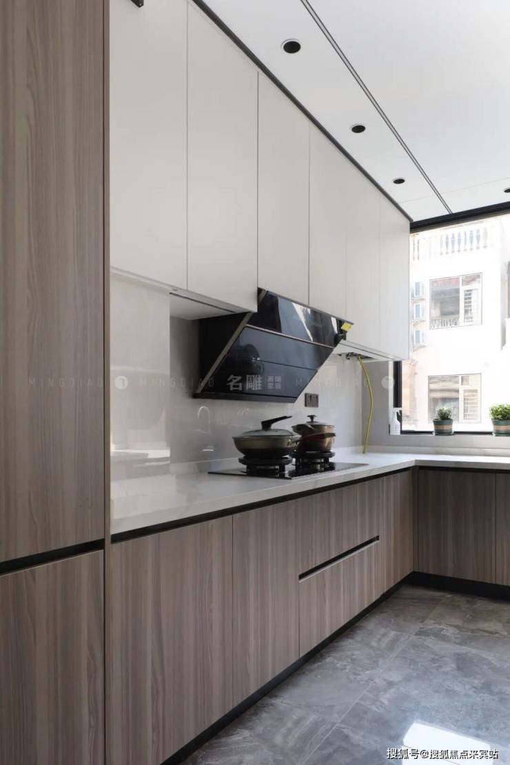 厨房采用U型布局,大面积留白设计,搭配木色柜子显得十分大气,地柜和吊柜满足业主超强的收纳需求。