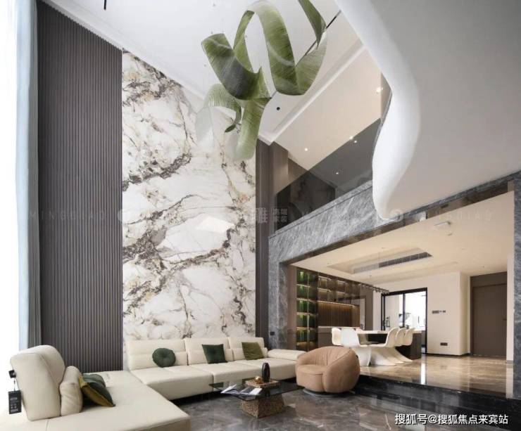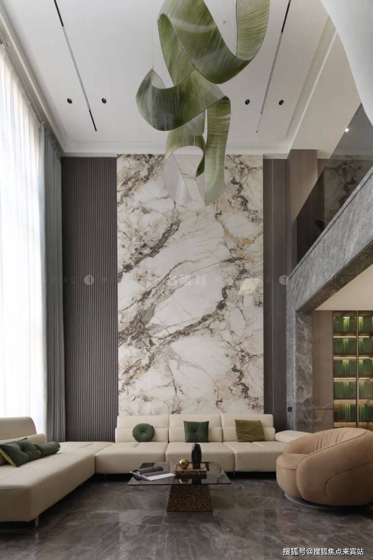 宛若游龙的艺术吊灯从高高的天花板垂下,通过造型、材质、曲线的组合呈现律动之态,极具艺术氛围,是客厅的一大点睛之笔,