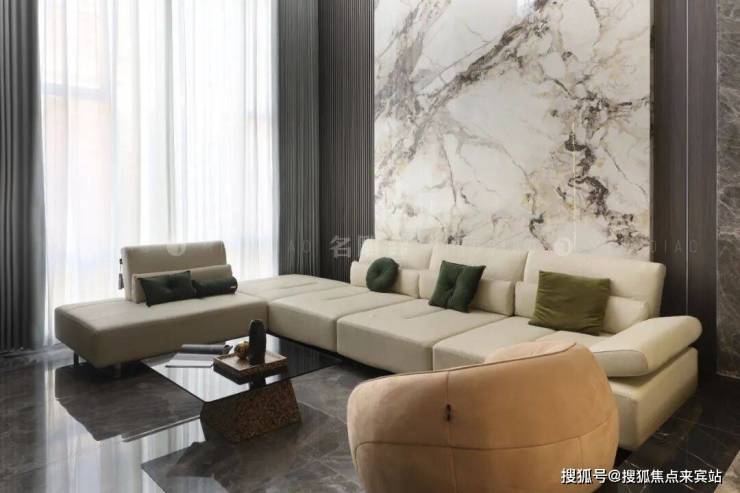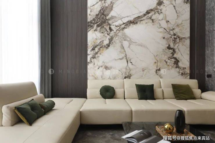 格栅+石纹背景墙与米白色沙发、灰色地板,在自然光线下,形成冷暖明暗的协调与对比,尽显现代美学下的纯粹与自然。