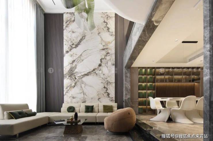 挑空空间,最大限度的呈露出整个空间的质感,散发着简约清透之美。整体摒弃了一切多余的装饰,通过高级灰与翡翠绿的融入,营造出现代时尚的空间氛围。