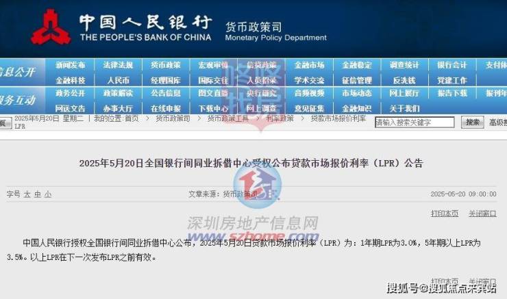 中国人民银行授权全国银行间同业拆借中心公布,2025年5月20日贷款市场报价利率(LPR)为:1年期LPR为3.0%,5年期以上LPR为3.5%。以上LPR在下一次发布LPR之前有效。
