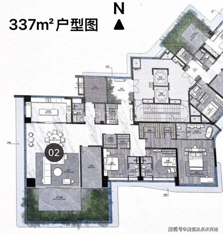 建面约 336㎡ 五房两厅四卫:项目楼王户型,专梯专户,270° 环幕视野,南向空中花园超 50㎡全赠送,100㎡超大社交方厅,主卧套房面积超 80㎡,高楼层可享无遮挡湿地公园全景,适配终极改善高净值客群。