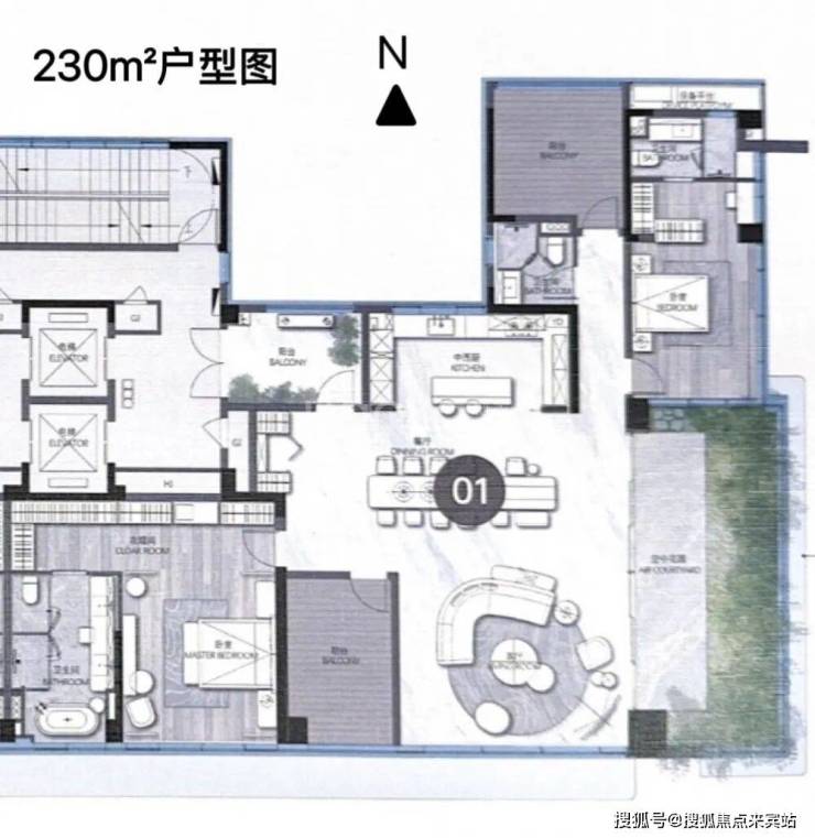 建面约 229㎡ 四房两厅三卫:项目入门级大平层,专梯专户私享独立电梯厅,LDKB 一体化大方厅设计,6 米挑高空中花园全赠送,双主卧套房布局,避免多代居住动线交叉,中高楼层可直望湿地公园景观。