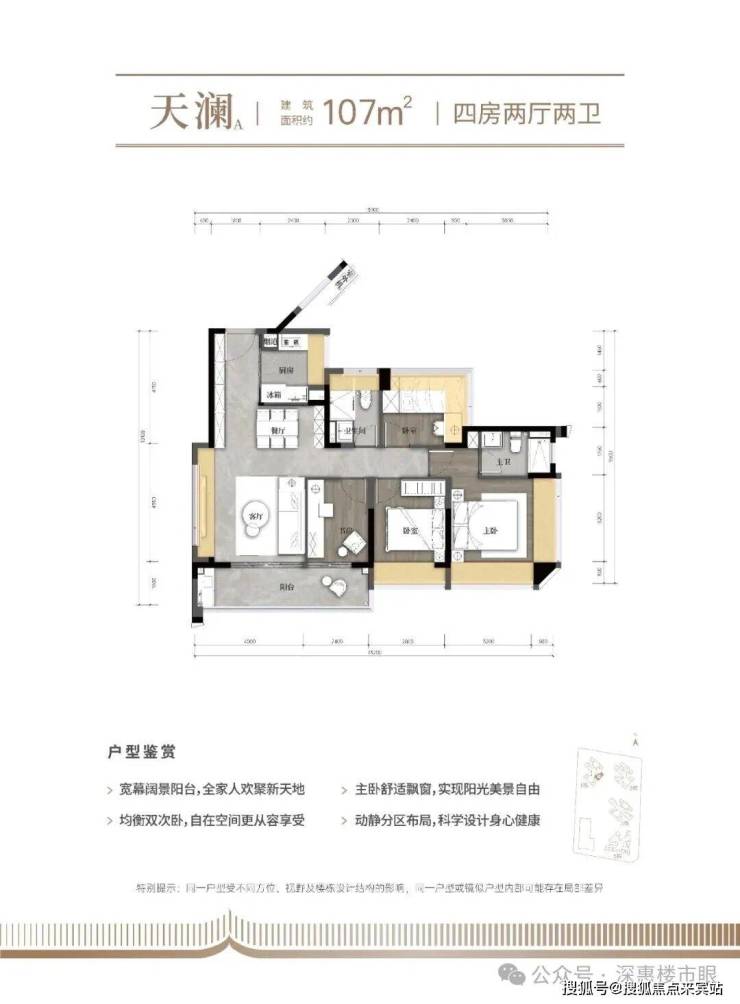 107m²的4房2厅2卫,折后总价429-465万/套,单价4.05-4.38万/m²。
