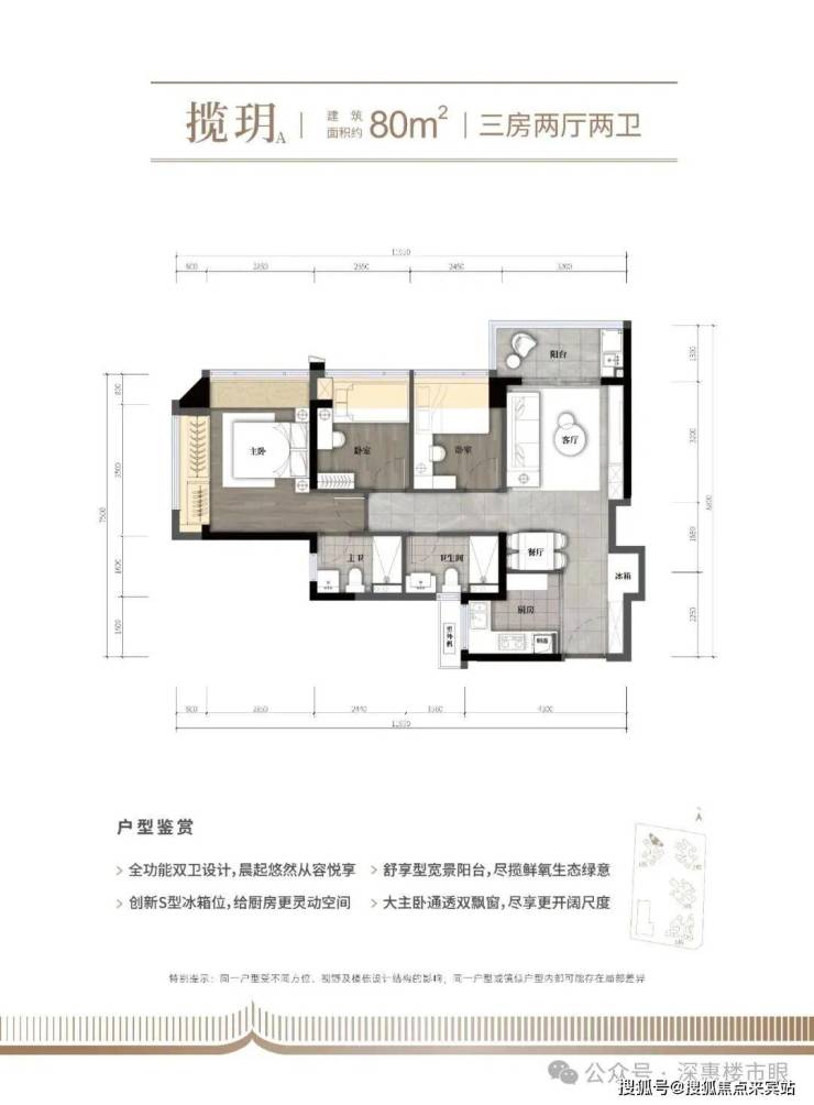 80m²的3房2厅2卫,折后总价298-322万/套,单价3.72-3.98万/m²。