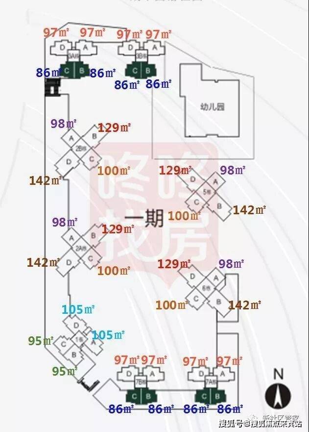 一期由6栋9座29/30层高层住宅加幼儿园(4栋)围合而成。楼间距30米左右相互遮挡影响小通风采光效果较佳.北区停车位有1140个,而北区总户数为1028户,车位比超1:1,车位充足. 3.2的容积率在市面上同类产品中属于较低水平舒适度较高。