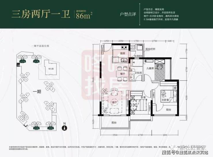 项目唯一90平方米以下单位,南向动静分区布局,3.5米宽客厅开间,1.6米宽阳台功能性优秀,主卧开间3.2米,舒适度较佳,2个次卧2.7米开间做双人房使用稍有些窄。飘窗设计,采光性能好。生活阳台方正实用性能较好。