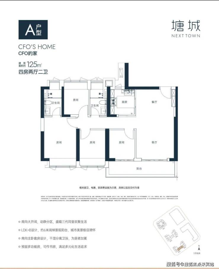 125㎡4房A户型:位于5栋4/5单元01梯腿,东南朝向,竖厅格局,客厅3.75米开间,LDKB一体化设计,U型厨房,南向主卧,主卧约12.6㎡,开间约4.1米,超大阳台,阳台约10.4㎡、开间约3.8米,得房率约80%。