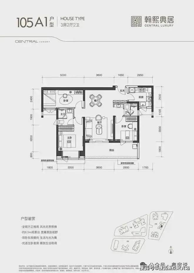 经典的双龙抱珠布局,主人空间与客卧空间互不干扰,具备私密性优势。并且户型方正,实用三房两厅两卫。朝南向四开间面宽共约 13.2m,全明空间,采光极佳。这个户型含赠送半阳台和飘窗的面积后使用率可达约 83%,这在超高层中是比较高的使用率。