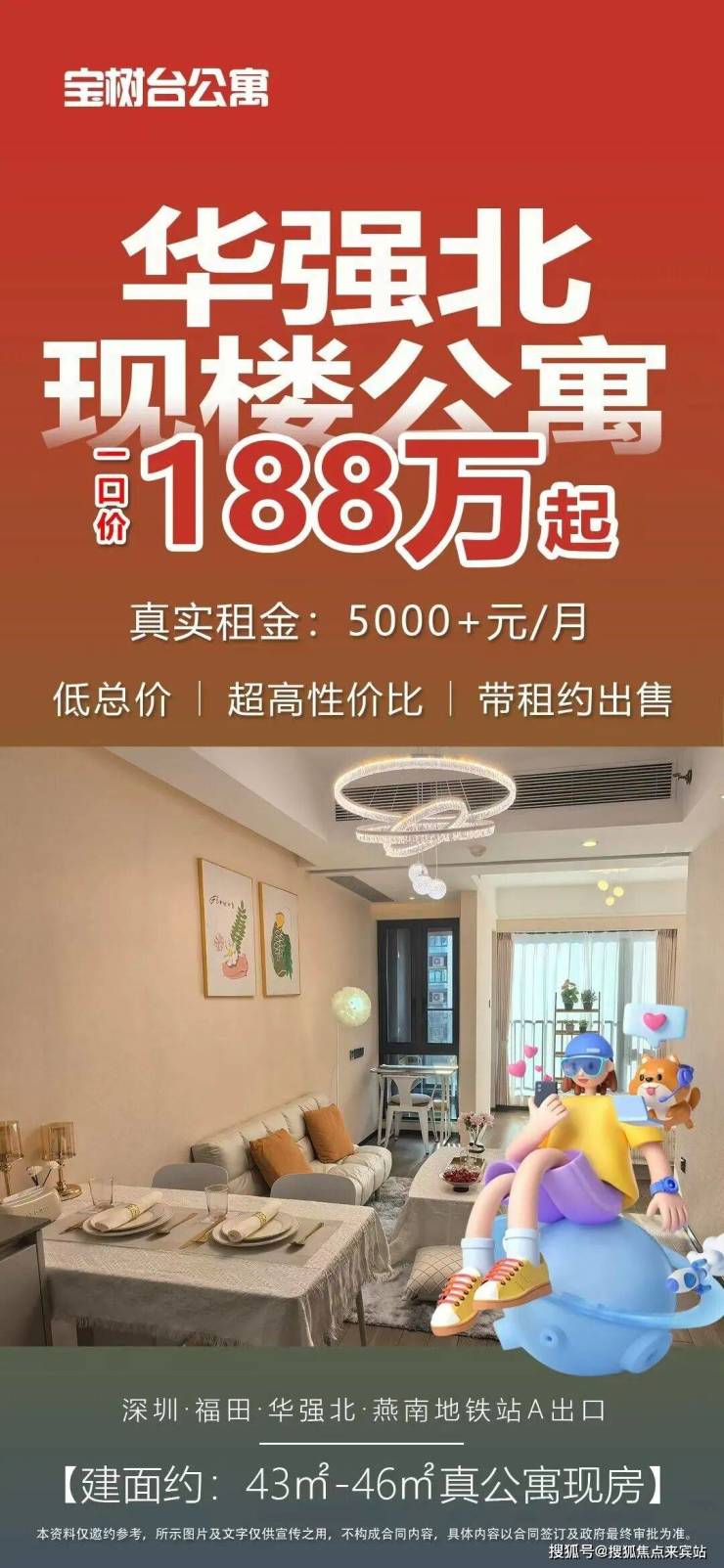 10.租稳回报高,抗跌性强43㎡月租金约 5000-6000 元,46㎡约 6000-6800 元,周边华强北白领、企业主等高净值客群需求旺盛,租金回报率稳定,核心地段资产抗跌性强。