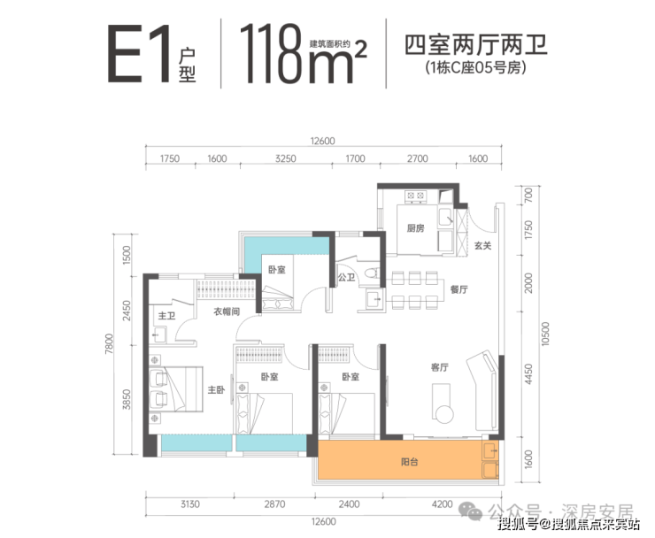 E1户型-118㎡的4房2厅2卫,设计的竖厅格局,客厅4.2米开间,四开间朝南,客厅连着卧室,带6.6米长的大阳台,西南朝向。