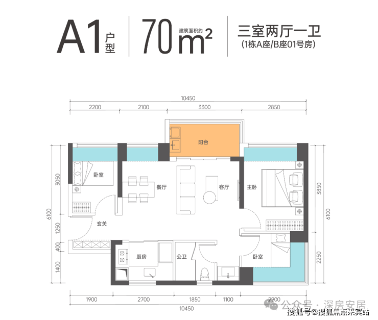 A1户型-70㎡的2房1卫,设计的竖厅格局,客厅3.3米开间,U型阳光厨房,有西南及东南朝向。