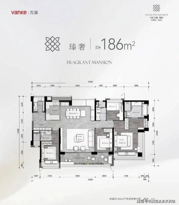 建面约 186m² 4 房 + 2 厅 3 卫 + 灵动空间,正南向 01、02 户型一线花地湾河涌景观视野,全明四开间朝南,约 18.3 米极致奢幕视野,LDKB 洄游路线,多功能巨幕宽厅,多功能岛台,端厅套房主卧