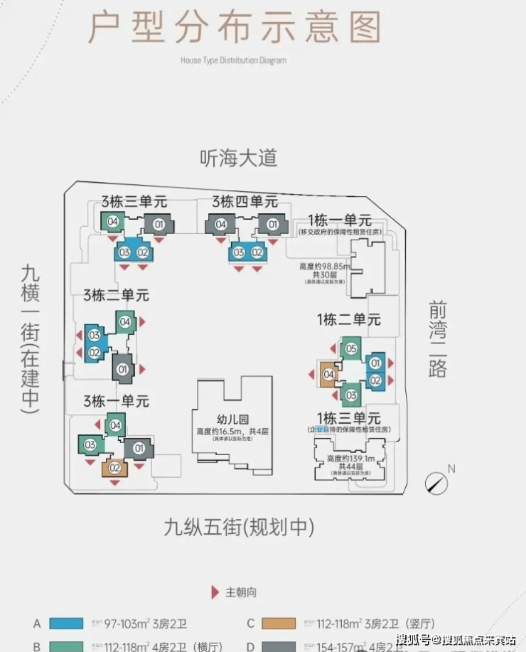 楼栋分布:7栋住宅(含2栋保障性租赁住房)+1所幼儿园,层高30-44层,3梯4-5户设计。