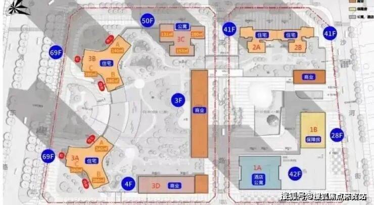 整个项目分两期开发建设,其中:项目一期东地块包含1栋酒店+商务公寓、1栋保障房、2栋包含一、二单元的住宅;西地块包含2栋高约250米的超高层住宅,另有1栋约50层高的商务公寓。