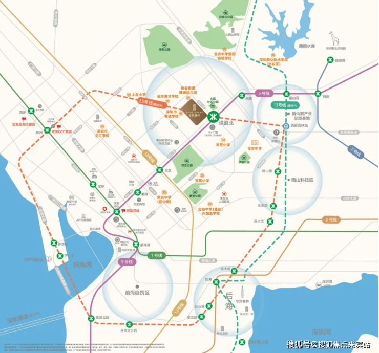 🚇地铁5号线(洪浪北地铁口):向南3站到达宝安中心站(串联1号线)、6站到达前海湾站(串联1/11号线);向北2站到达留仙洞总部基地、7站到达深圳北站;