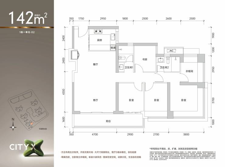142-143㎡户型:4+1房两厅两卫(东南朝向,看河西公园)