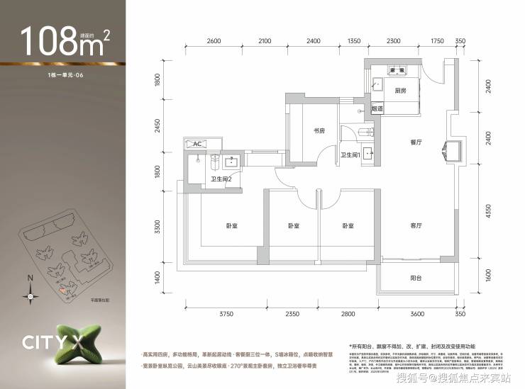 108㎡户型:四房两厅两卫(四开间朝南,客厅3.6米开间)