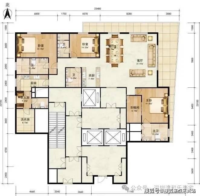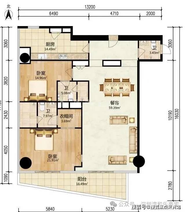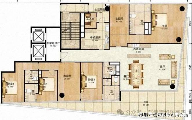 5-19层,202㎡,2房2厅2卫,朝西北,得房率,76.43%。