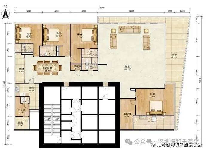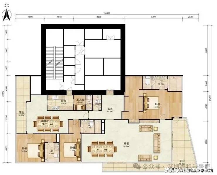 12-34层,330-340㎡,3房2厅4卫,朝东,得房率74.53%。
