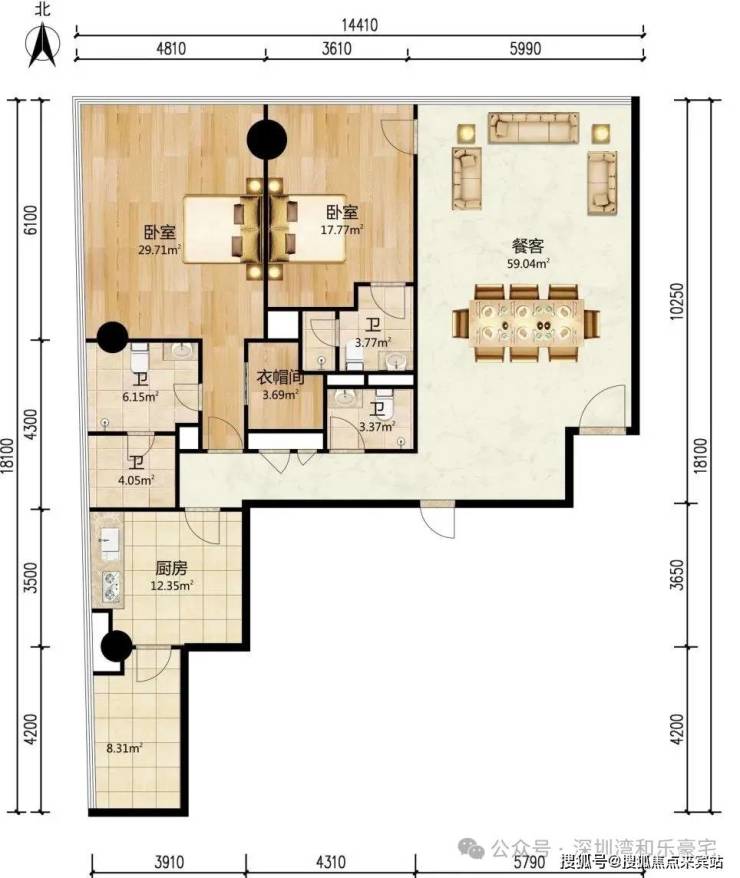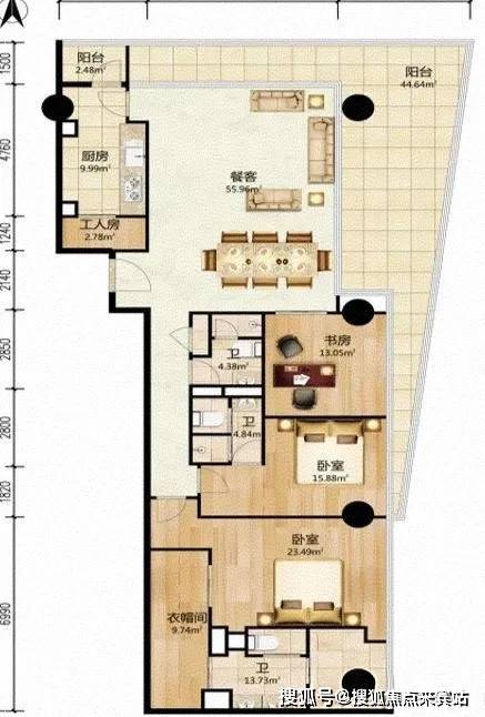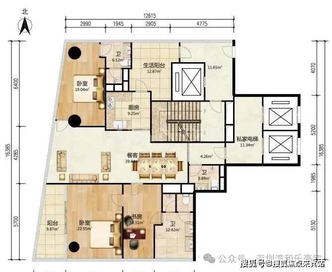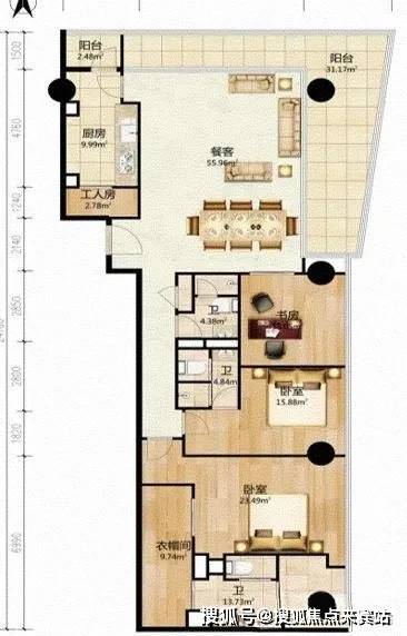 优点:3.45米极限层高,主卧双向景观面,静谧书房及6米客厅开间,餐客一体。