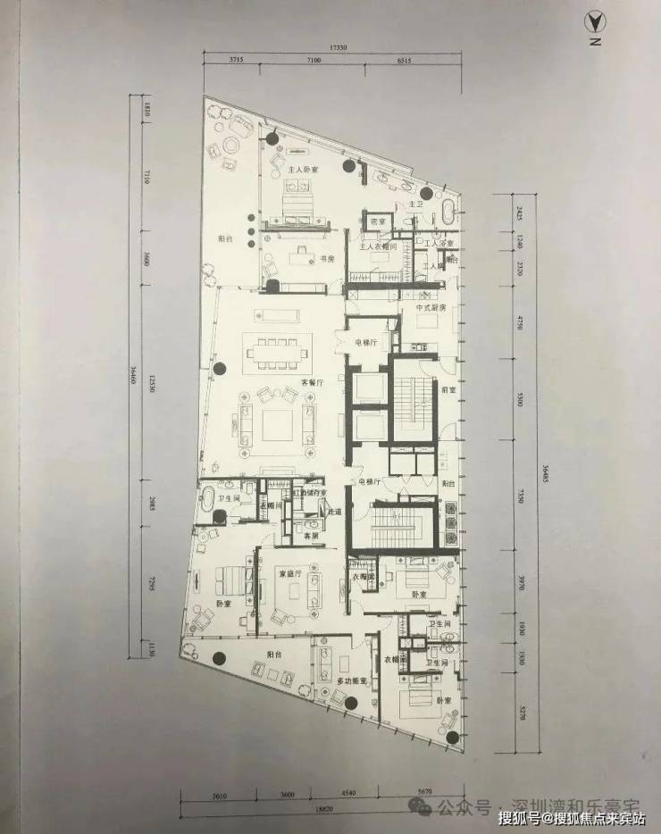 21-49层,509-523㎡,5房3厅5卫,朝东北,得房率78.66%。